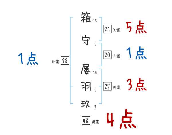 外運![]() | 箱守屡羽玖さんの外運は28画の1つ星!家庭環境に注意。スポーツで活躍できる能力があるかも。 生活面を象徴する運勢です。外部から受ける影響力を表し、結婚運、家庭運や職場、環境への順応性を表します。 |