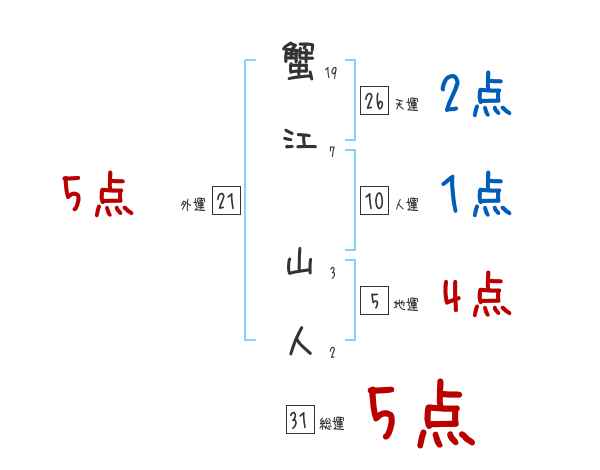 地運![]() | 蟹江山人さんの地運は5画の4つ星!健康で安泰。協調性に優れ、財産に恵まれる。 個性を表す基礎的な運勢です。性格形成や対人関係、行動力など家庭環境に影響されます。主に誕生してから20歳くらいまでの若年期の運勢を表します。 |