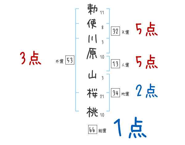 人運![]() | 勅使川原山桜桃さんの人運は13画の5つ星!才能に恵まれ人気がある。名声を手に入れる。円満な人生。 性格や才能などを表す2番目に重要な運勢です。人間関係や協調性、社会的な成功に影響します。主に20歳から50歳ぐらいまでの中年期の運勢を表します。 |