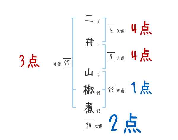 総運![]() | 二井山椒煮さんの総運は34画の2つ星!独創性に優れるが、自尊心が強く災難に注意しましょう。 あなたの人生を表す1番重要な運勢です。生涯を通じて影響する総合運となり、主に50歳以降の晩年期に影響を及ぼします。 |