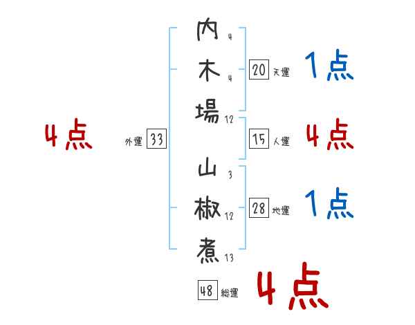 外運![]() | 内木場山椒煮さんの外運は33画の4つ星!権力志向でプライドが高い。勇気があり運を切り開き成功する。 生活面を象徴する運勢です。外部から受ける影響力を表し、結婚運、家庭運や職場、環境への順応性を表します。 |