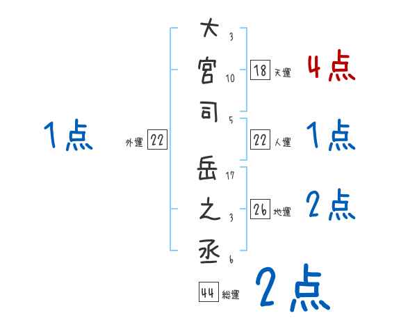 外運![]() | 大宮司岳之丞さんの外運は22画の1つ星!努力することが苦手ないっぽう手先が器用。芸術性にも優れる。 生活面を象徴する運勢です。外部から受ける影響力を表し、結婚運、家庭運や職場、環境への順応性を表します。 |