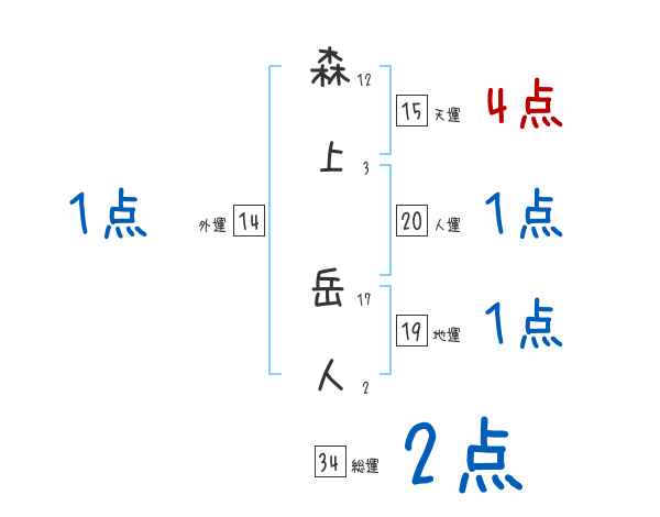 総運![]() | 森上岳人さんの総運は34画の2つ星!独創性に優れるが、自尊心が強く災難に注意しましょう。 あなたの人生を表す1番重要な運勢です。生涯を通じて影響する総合運となり、主に50歳以降の晩年期に影響を及ぼします。 |
