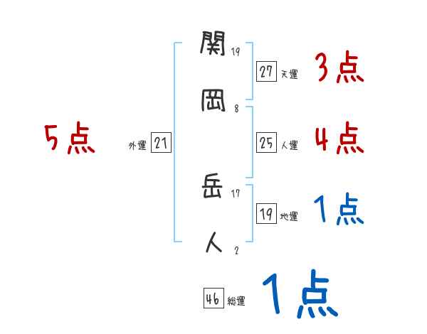 総運![]() | 関岡岳人さんの総運は46画の1つ星!迷走することが多く苦労するかも。目先のことにとらわれないように。 あなたの人生を表す1番重要な運勢です。生涯を通じて影響する総合運となり、主に50歳以降の晩年期に影響を及ぼします。 |