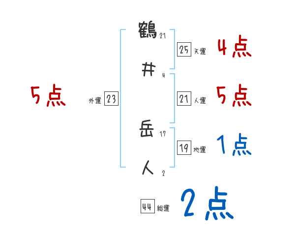 天運![]() | 鶴井岳人さんの天運は25画の4つ星!個性があり才能があふれる。強運の持ち主で発展する。 家系が持つ宿命的な運勢を表します。祖先から受け継いだ苗字ですので自分の力が及びません。家柄を象徴します。 |