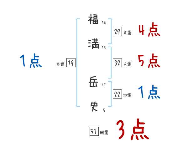 人運![]() | 福満岳史さんの人運は32画の5つ星!柔軟性があり成功する。チャンスが多く金運が良い。 性格や才能などを表す2番目に重要な運勢です。人間関係や協調性、社会的な成功に影響します。主に20歳から50歳ぐらいまでの中年期の運勢を表します。 |