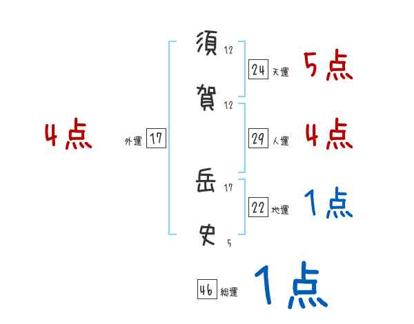 外運![]() | 須賀岳史さんの外運は17画の4つ星!積極的な行動力。地位を気づき財産を手に入れる。純粋な心と直感力。 生活面を象徴する運勢です。外部から受ける影響力を表し、結婚運、家庭運や職場、環境への順応性を表します。 |