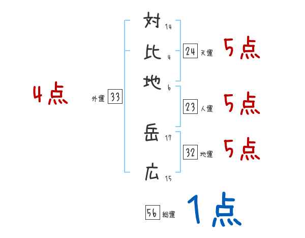 外運![]() | 対比地岳広さんの外運は33画の4つ星!権力志向でプライドが高い。勇気があり運を切り開き成功する。 生活面を象徴する運勢です。外部から受ける影響力を表し、結婚運、家庭運や職場、環境への順応性を表します。 |