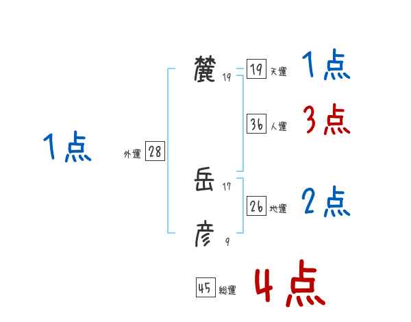外運![]() | 麓岳彦さんの外運は28画の1つ星!家庭環境に注意。スポーツで活躍できる能力があるかも。 生活面を象徴する運勢です。外部から受ける影響力を表し、結婚運、家庭運や職場、環境への順応性を表します。 |
