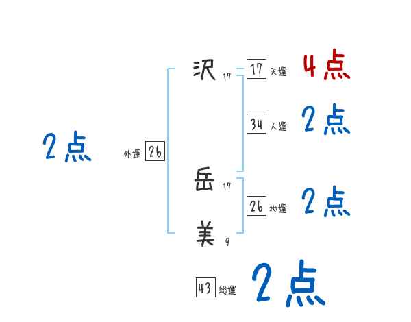 総運![]() | 沢岳美さんの総運は43画の2つ星!頑固な性格で独立心が強いかも。やや非現実的で浪費に注意しましょう。 あなたの人生を表す1番重要な運勢です。生涯を通じて影響する総合運となり、主に50歳以降の晩年期に影響を及ぼします。 |