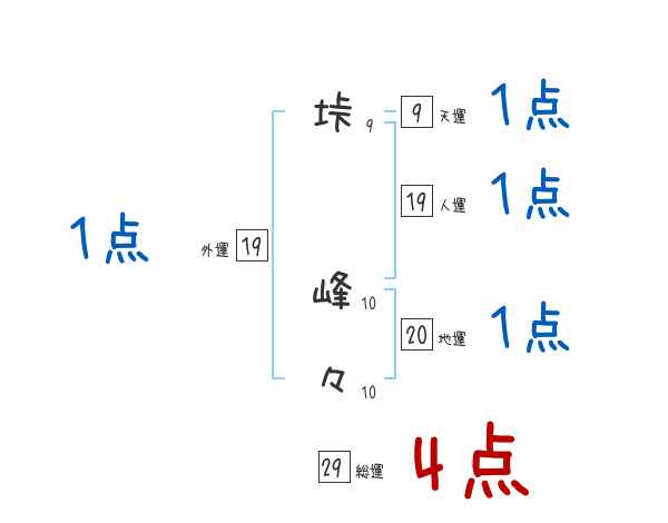 天運![]() | 垰峰々さんの天運は9画の1つ星!消極的で才能を発揮することが苦手なことも。周りの意見に耳を傾けましょう。 家系が持つ宿命的な運勢を表します。祖先から受け継いだ苗字ですので自分の力が及びません。家柄を象徴します。 |