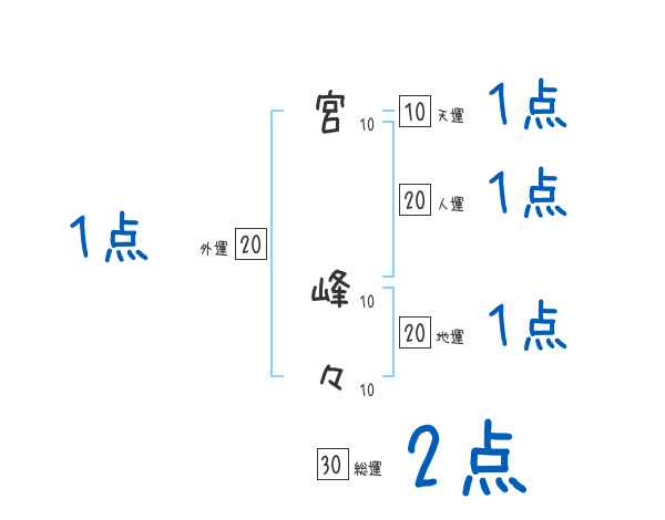 天運![]() | 宮峰々さんの天運は10画の1つ星!不安を感じやすい傾向。ストレスを抱えないように注意しましょう。 家系が持つ宿命的な運勢を表します。祖先から受け継いだ苗字ですので自分の力が及びません。家柄を象徴します。 |