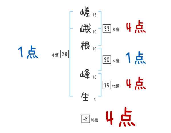 総運![]() | 嵯峨根峰生さんの総運は48画の4つ星!賢明な性格で人望が厚い。指導力があり多くの人に尊敬される。 あなたの人生を表す1番重要な運勢です。生涯を通じて影響する総合運となり、主に50歳以降の晩年期に影響を及ぼします。 |