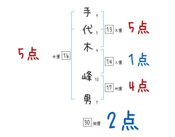 外運![]() | 手代木峰男さんの外運は16画の5つ星!人望が厚く大きく発展する。逆転成功が見える。 生活面を象徴する運勢です。外部から受ける影響力を表し、結婚運、家庭運や職場、環境への順応性を表します。 |