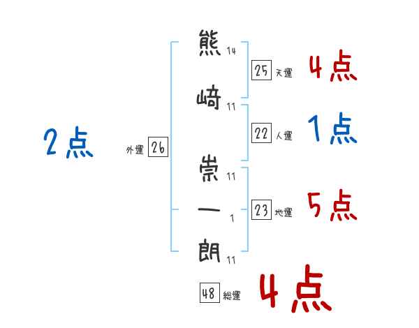 天運![]() | 熊﨑崇一朗さんの天運は25画の4つ星!個性があり才能があふれる。強運の持ち主で発展する。 家系が持つ宿命的な運勢を表します。祖先から受け継いだ苗字ですので自分の力が及びません。家柄を象徴します。 |