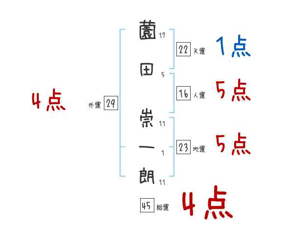 | 人運  | 薗田崇一朗さんの人運は16画の5つ星!人望が厚く大きく発展する。逆転成功が見える。性格や才能などを表す2番目に重要な運勢です。人間関係や協調性、社会的な成功に影響します。主に20歳から50歳ぐらいまでの中年期の運勢を表します。 |