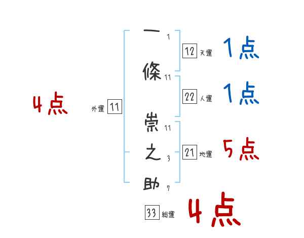 天運![]() | 一條崇之助さんの天運は12画の1つ星!簡単な失敗で諦めてしまいやすいかも。着実に行動すると良いでしょう。 家系が持つ宿命的な運勢を表します。祖先から受け継いだ苗字ですので自分の力が及びません。家柄を象徴します。 |