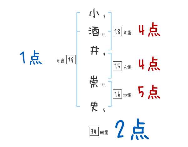 外運![]() | 小酒井崇史さんの外運は19画の1つ星!優れた才能を持ちますが、協調性が足りないことも。周りの人と協力する事を意識しましょう。 生活面を象徴する運勢です。外部から受ける影響力を表し、結婚運、家庭運や職場、環境への順応性を表します。 |