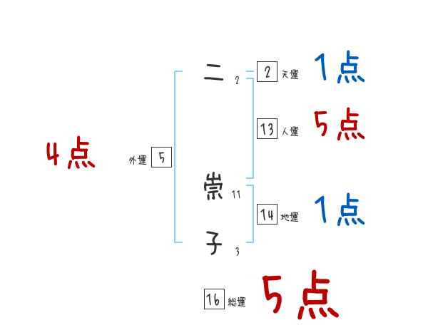 人運![]() | 二崇子さんの人運は13画の5つ星!才能に恵まれ人気がある。名声を手に入れる。円満な人生。 性格や才能などを表す2番目に重要な運勢です。人間関係や協調性、社会的な成功に影響します。主に20歳から50歳ぐらいまでの中年期の運勢を表します。 |