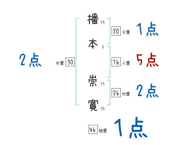 総運![]() | 播本崇寛さんの総運は46画の1つ星!迷走することが多く苦労するかも。目先のことにとらわれないように。 あなたの人生を表す1番重要な運勢です。生涯を通じて影響する総合運となり、主に50歳以降の晩年期に影響を及ぼします。 |
