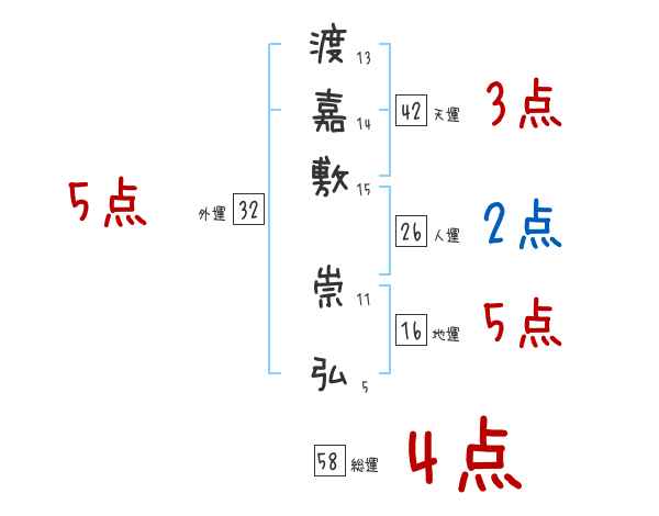 外運![]() | 渡嘉敷崇弘さんの外運は32画の5つ星!柔軟性があり成功する。チャンスが多く金運が良い。 生活面を象徴する運勢です。外部から受ける影響力を表し、結婚運、家庭運や職場、環境への順応性を表します。 |