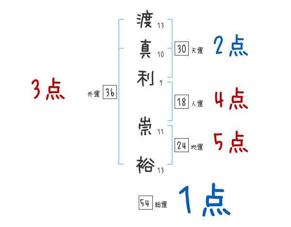 天運![]() | 渡真利崇裕さんの天運は30画の2つ星!浮き沈みの激しさに注意しましょう。 家系が持つ宿命的な運勢を表します。祖先から受け継いだ苗字ですので自分の力が及びません。家柄を象徴します。 |