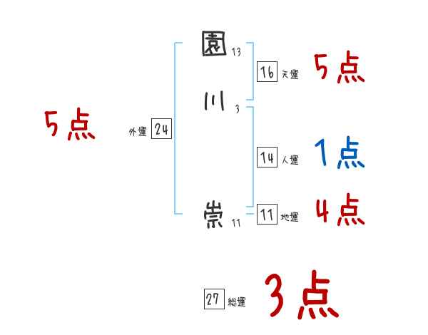 外運![]() | 園川崇さんの外運は24画の5つ星!家庭運が良く順調な人生。金運にも恵まれる。 生活面を象徴する運勢です。外部から受ける影響力を表し、結婚運、家庭運や職場、環境への順応性を表します。 |