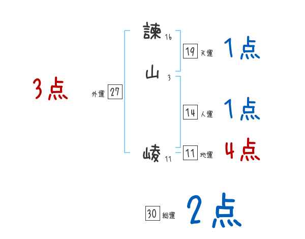 総運![]() | 諫山崚さんの総運は30画の2つ星!浮き沈みの激しさに注意しましょう。 あなたの人生を表す1番重要な運勢です。生涯を通じて影響する総合運となり、主に50歳以降の晩年期に影響を及ぼします。 |