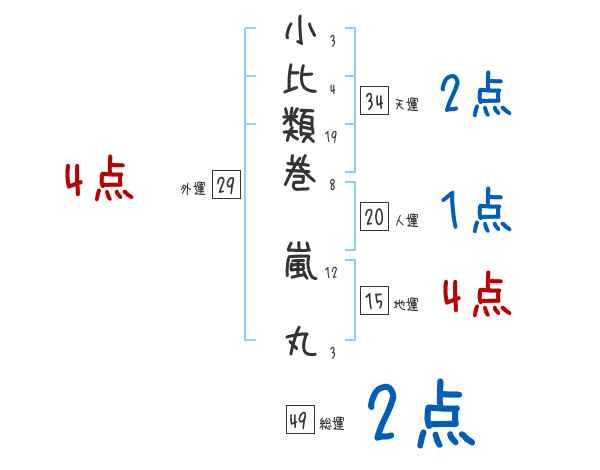地運![]() | 小比類巻嵐丸さんの地運は15画の4つ星!人徳があり出世する。順調に物事を進め円満な人生。 個性を表す基礎的な運勢です。性格形成や対人関係、行動力など家庭環境に影響されます。主に誕生してから20歳くらいまでの若年期の運勢を表します。 |