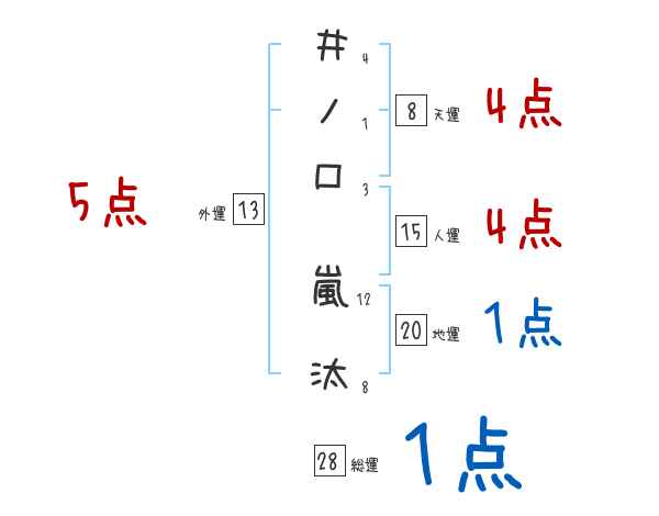総運![]() | 井ノ口嵐汰さんの総運は28画の1つ星!家庭環境に注意。スポーツで活躍できる能力があるかも。 あなたの人生を表す1番重要な運勢です。生涯を通じて影響する総合運となり、主に50歳以降の晩年期に影響を及ぼします。 |