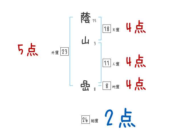外運![]() | 蔭山嵒さんの外運は23画の5つ星!想像力に優れ活力がある。一代で成功し名誉を手に入れる。 生活面を象徴する運勢です。外部から受ける影響力を表し、結婚運、家庭運や職場、環境への順応性を表します。 |