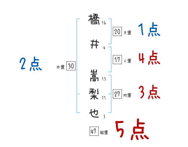 総運![]() | 橋井嵩梨也さんの総運は47画の5つ星!実力が開花し発展する円満な人生。財に恵まれる。 あなたの人生を表す1番重要な運勢です。生涯を通じて影響する総合運となり、主に50歳以降の晩年期に影響を及ぼします。 |
