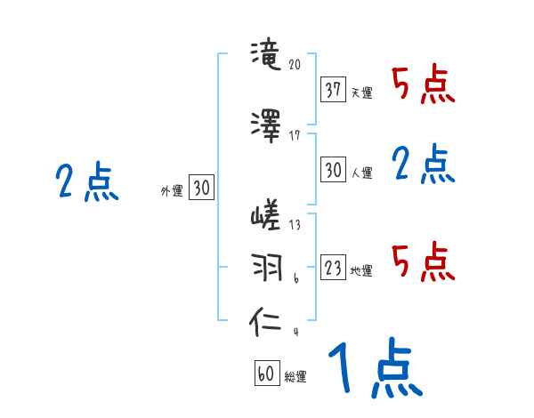 外運![]() | 滝澤嵯羽仁さんの外運は30画の2つ星!浮き沈みの激しさに注意しましょう。 生活面を象徴する運勢です。外部から受ける影響力を表し、結婚運、家庭運や職場、環境への順応性を表します。 |