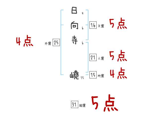 天運![]() | 日向寺嶢さんの天運は16画の5つ星!人望が厚く大きく発展する。逆転成功が見える。 家系が持つ宿命的な運勢を表します。祖先から受け継いだ苗字ですので自分の力が及びません。家柄を象徴します。 |