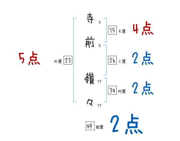 天運![]() | 寺前嶺々さんの天運は15画の4つ星!人徳があり出世する。順調に物事を進め円満な人生。 家系が持つ宿命的な運勢を表します。祖先から受け継いだ苗字ですので自分の力が及びません。家柄を象徴します。 |