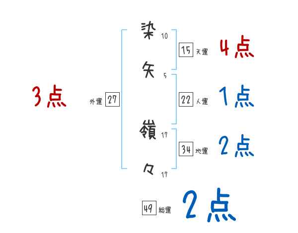 外運![]() | 染矢嶺々さんの外運は27画の3つ星!頭脳明晰だが強情で摩擦が多い傾向。孤立に注意。 生活面を象徴する運勢です。外部から受ける影響力を表し、結婚運、家庭運や職場、環境への順応性を表します。 |
