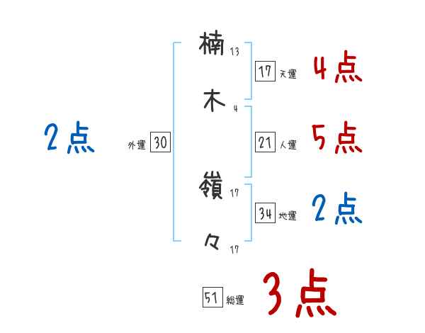 外運![]() | 楠木嶺々さんの外運は30画の2つ星!浮き沈みの激しさに注意しましょう。 生活面を象徴する運勢です。外部から受ける影響力を表し、結婚運、家庭運や職場、環境への順応性を表します。 |
