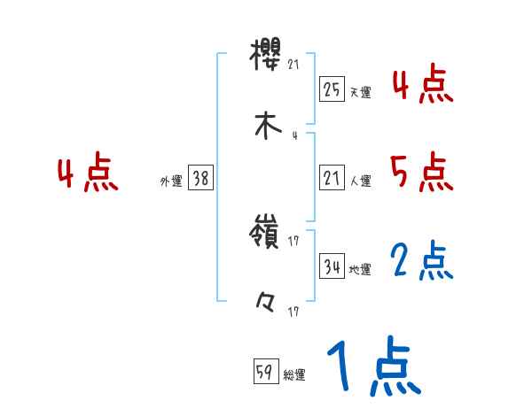 人運![]() | 櫻木嶺々さんの人運は21画の5つ星!統率力がある。独立し成功する。名誉を手に入れる。 性格や才能などを表す2番目に重要な運勢です。人間関係や協調性、社会的な成功に影響します。主に20歳から50歳ぐらいまでの中年期の運勢を表します。 |