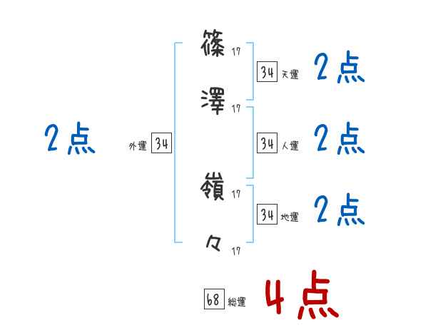 総運![]() | 篠澤嶺々さんの総運は68画の4つ星!潜在能力が高く集中力が高い。勤勉に励み発展する。 あなたの人生を表す1番重要な運勢です。生涯を通じて影響する総合運となり、主に50歳以降の晩年期に影響を及ぼします。 |