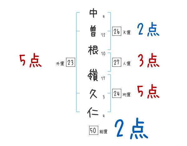 外運![]() | 中曽根嶺久仁さんの外運は23画の5つ星!想像力に優れ活力がある。一代で成功し名誉を手に入れる。 生活面を象徴する運勢です。外部から受ける影響力を表し、結婚運、家庭運や職場、環境への順応性を表します。 |