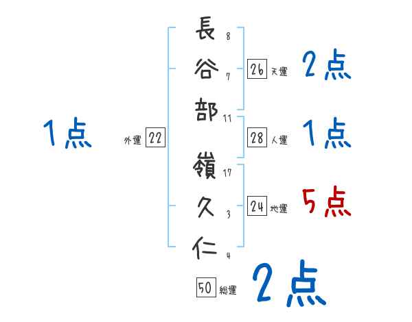 天運![]() | 長谷部嶺久仁さんの天運は26画の2つ星!波瀾万丈かも。信頼できる人を大事にしましょう。 家系が持つ宿命的な運勢を表します。祖先から受け継いだ苗字ですので自分の力が及びません。家柄を象徴します。 |