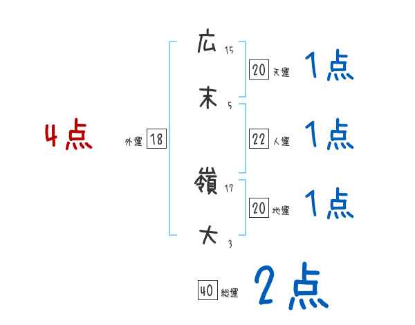 人運![]() | 広末嶺大さんの人運は22画の1つ星!努力することが苦手ないっぽう手先が器用。芸術性にも優れる。 性格や才能などを表す2番目に重要な運勢です。人間関係や協調性、社会的な成功に影響します。主に20歳から50歳ぐらいまでの中年期の運勢を表します。 |