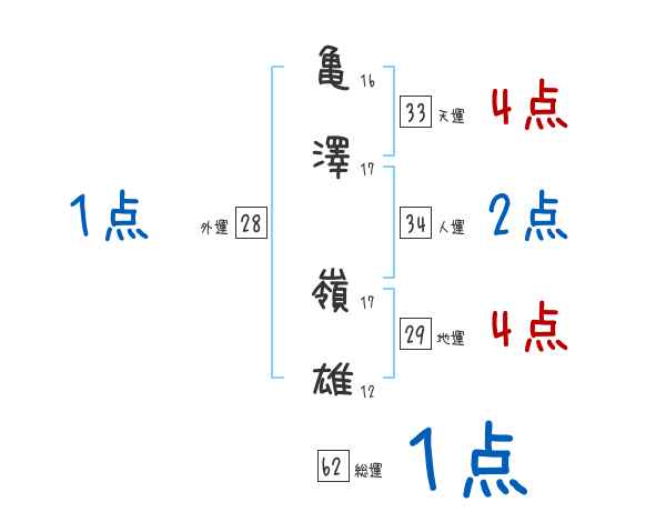 天運![]() | 亀澤嶺雄さんの天運は33画の4つ星!権力志向でプライドが高い。勇気があり運を切り開き成功する。 家系が持つ宿命的な運勢を表します。祖先から受け継いだ苗字ですので自分の力が及びません。家柄を象徴します。 |