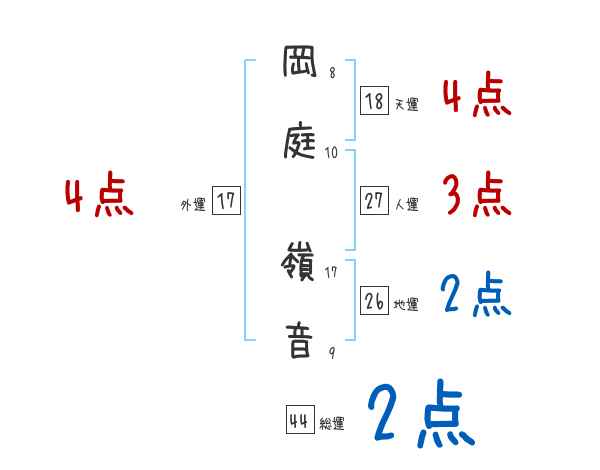 天運![]() | 岡庭嶺音さんの天運は18画の4つ星!情熱的で剛気。忍耐力があり信頼される。 家系が持つ宿命的な運勢を表します。祖先から受け継いだ苗字ですので自分の力が及びません。家柄を象徴します。 |