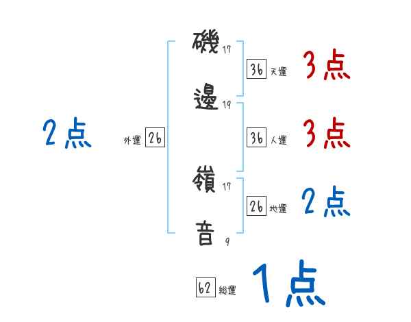 天運![]() | 磯邊嶺音さんの天運は36画の3つ星!先見性が豊かです。多少神経質で苦労することも。 家系が持つ宿命的な運勢を表します。祖先から受け継いだ苗字ですので自分の力が及びません。家柄を象徴します。 |