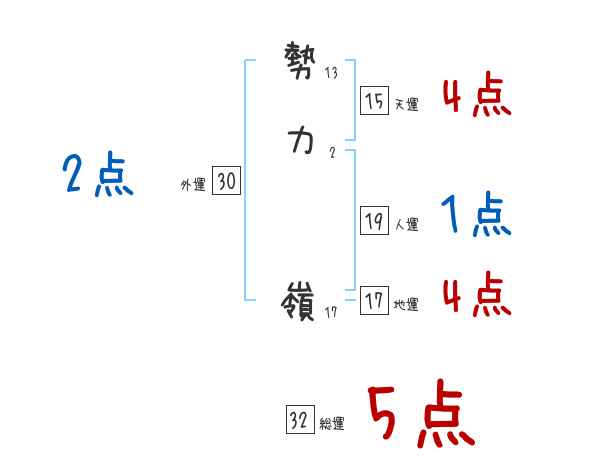 総運![]() | 勢力嶺さんの総運は32画の5つ星!柔軟性があり成功する。チャンスが多く金運が良い。 あなたの人生を表す1番重要な運勢です。生涯を通じて影響する総合運となり、主に50歳以降の晩年期に影響を及ぼします。 |
