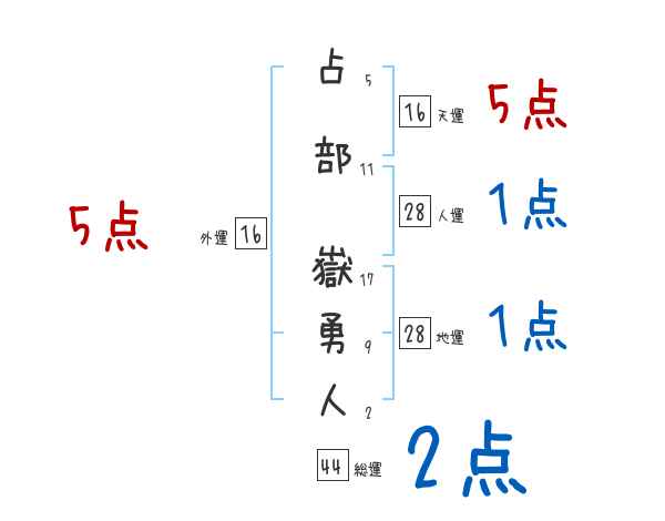 天運![]() | 占部嶽勇人さんの天運は16画の5つ星!人望が厚く大きく発展する。逆転成功が見える。 家系が持つ宿命的な運勢を表します。祖先から受け継いだ苗字ですので自分の力が及びません。家柄を象徴します。 |