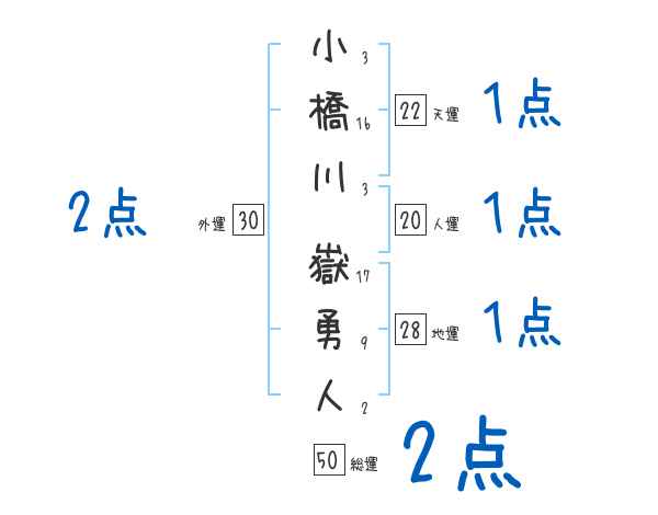 外運![]() | 小橋川嶽勇人さんの外運は30画の2つ星!浮き沈みの激しさに注意しましょう。 生活面を象徴する運勢です。外部から受ける影響力を表し、結婚運、家庭運や職場、環境への順応性を表します。 |