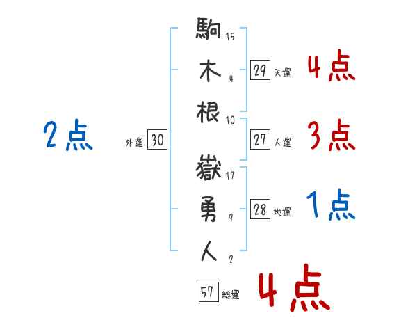 天運![]() | 駒木根嶽勇人さんの天運は29画の4つ星!完全主義で才能がある。厳格な心の持ち主。 家系が持つ宿命的な運勢を表します。祖先から受け継いだ苗字ですので自分の力が及びません。家柄を象徴します。 |