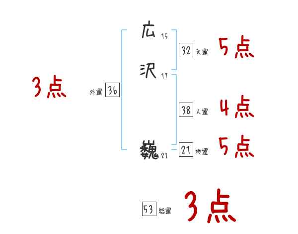 総運![]() | 広沢巍さんの総運は53画の3つ星!やや見栄っ張りで虚栄心がある。散財に注意。 あなたの人生を表す1番重要な運勢です。生涯を通じて影響する総合運となり、主に50歳以降の晩年期に影響を及ぼします。 |